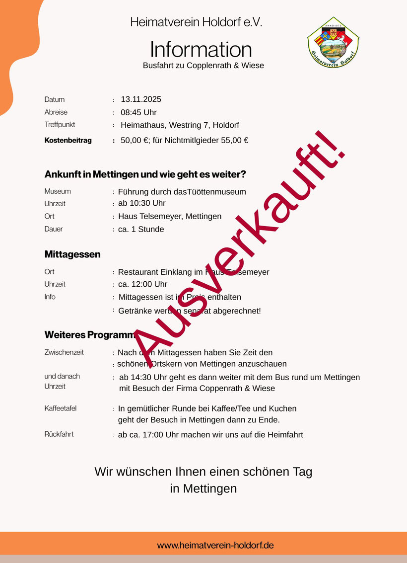 Die Vorsitzende des Heimatvereins Eva-Maria Junker-Schlarmann überreichte Herrn Alfred Bäuning im Beisein des Vorstandes den 1. Preis (Gutschein für eine Fahrt des Heimatvereins) aus Anlass des Gewinnspiels während der Jubiläumsfeier zum 50jährigen Bestehen des Heimatvereins Holdorf.